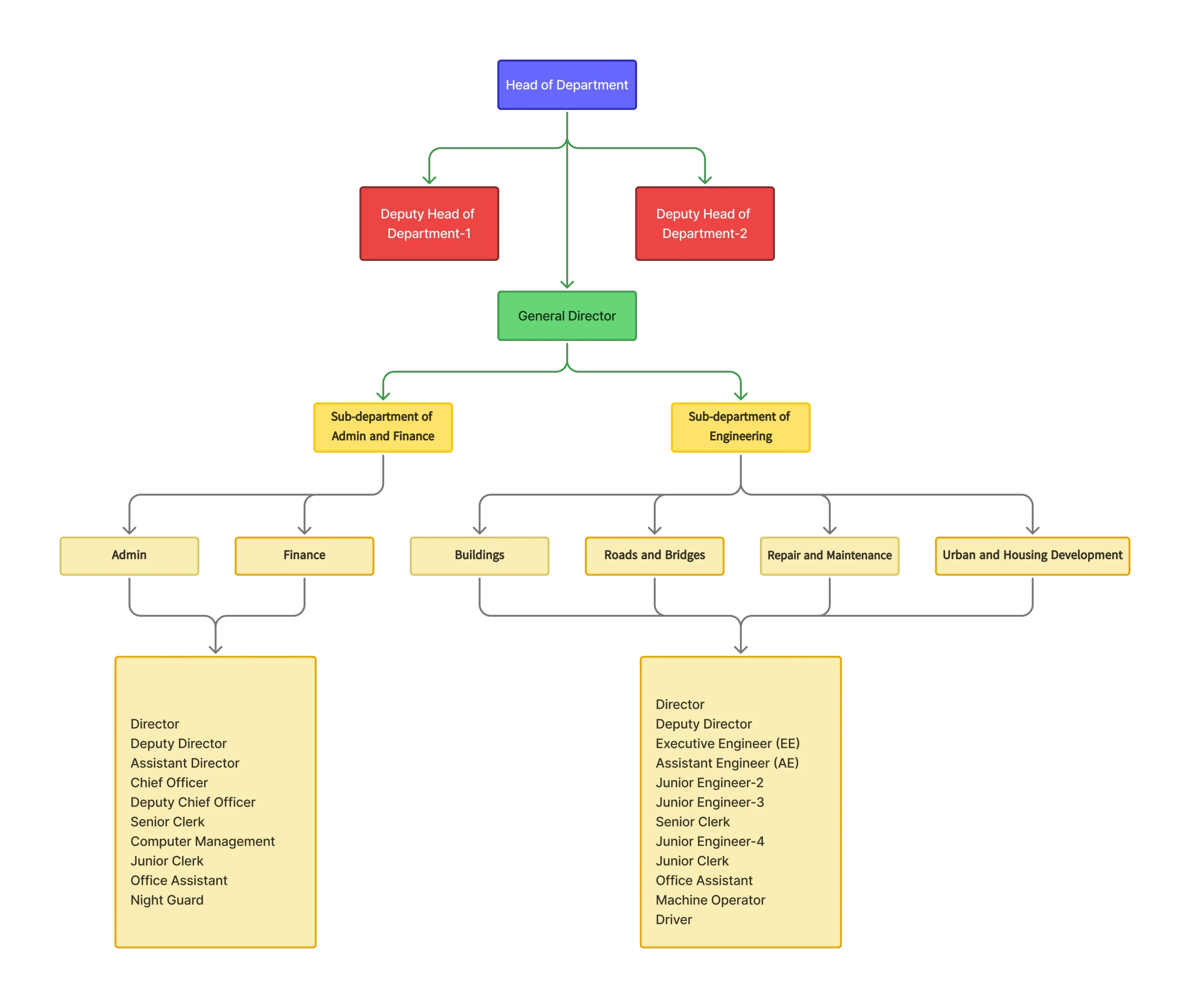 The Department of Construction is overseen by one Head Department and two Deputy Heads, and is organized into the Administration and Finance Sub-department and the Engineering Sub-department. The Administration and Finance Sub-department includes the Administration Section and the Finance Section. The Engineering Sub-department comprises the Building Section, the Road and Bridge Section, the Maintenance Section, and the Urban and Housing Development Section.