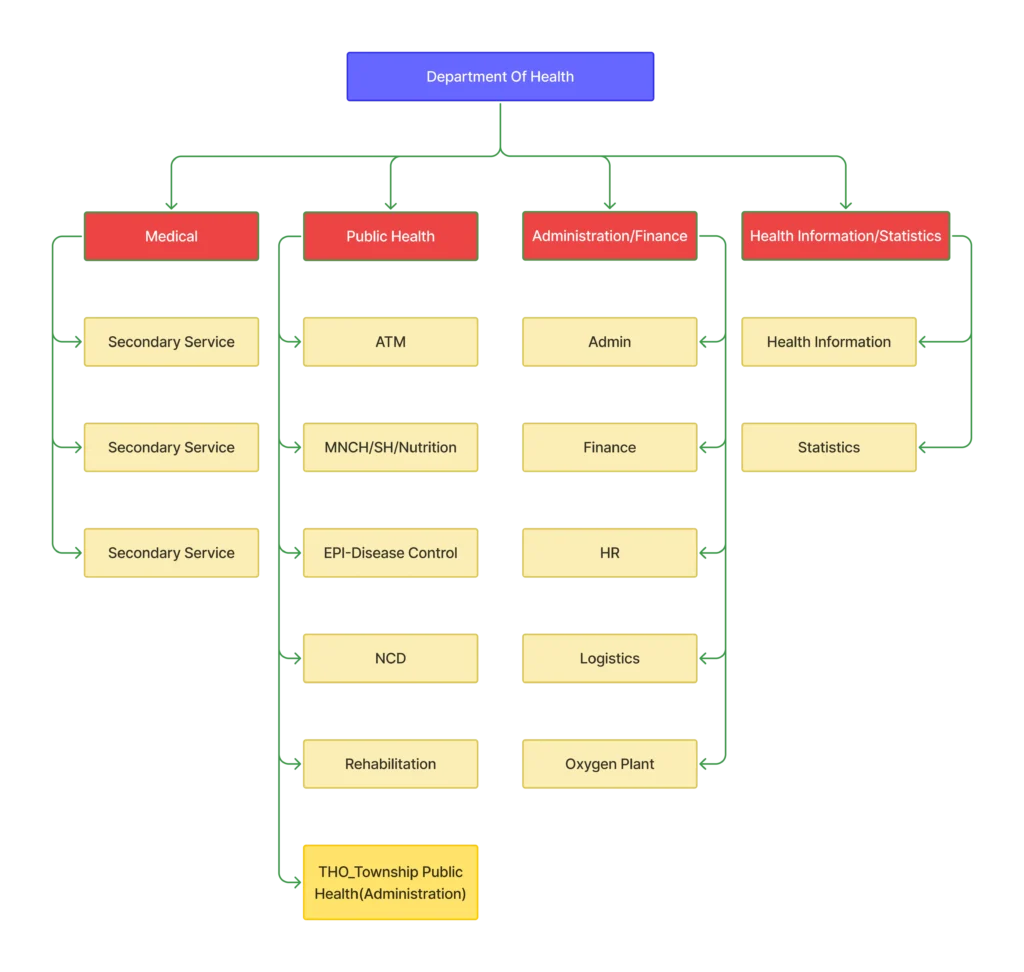 The Medical Services Sub-department is run by Tamawtyhar Hospital, O1 Hospital, Karenni Charity Clinic, Phoenix Rehabilitation Center, Phoenix Prosthetic Workshop, and the Public Health Sub-department with township health officers, employing a total of 115 staff members.