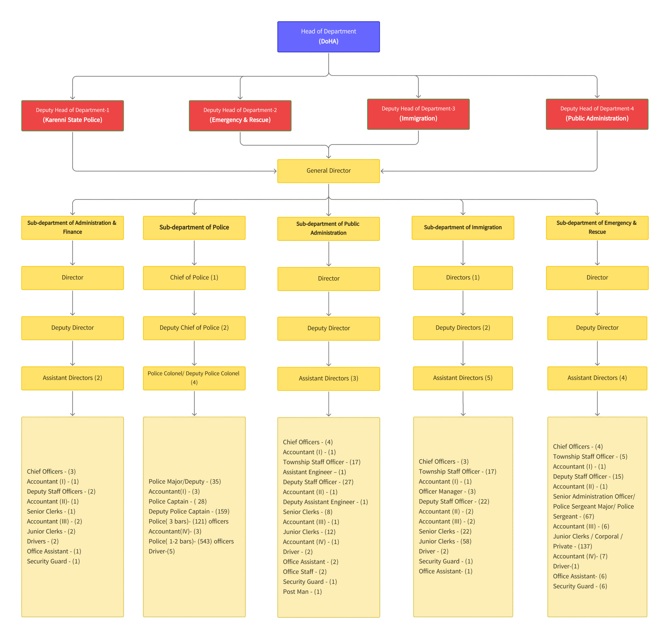 The Department of Home Affairs is led by one Head of Department and four Deputy Heads, and it is composed of sub-departments: the Public Administration Sub-department, the Law Enforcement and Security Sub-department (Karenni State Police), the Immigration Sub-department, and the Emergency and Rescue Sub-department. It also handles municipal and welfare services for the public.