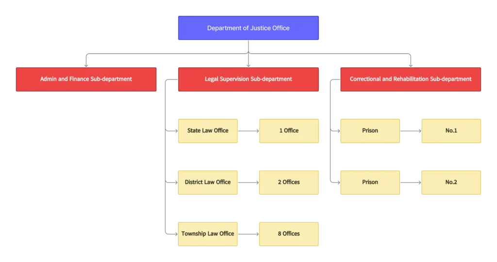 The office of the Department of Justice reviews and provides recommendations on laws, rules, regulations, announcements, orders, directives, procedures, and manuals. The Administration and Finance Sub-department handles personnel matters, administration, and fundraising. The Legal Affairs Supervision Sub-department oversees the operations of one State Law Office, two District Law Offices, and eight Township Law offices to manage legal affairs. The Sub-department of Moral Corrections and Rehabilitation manages Prison No. 1 and Prison No. 2.