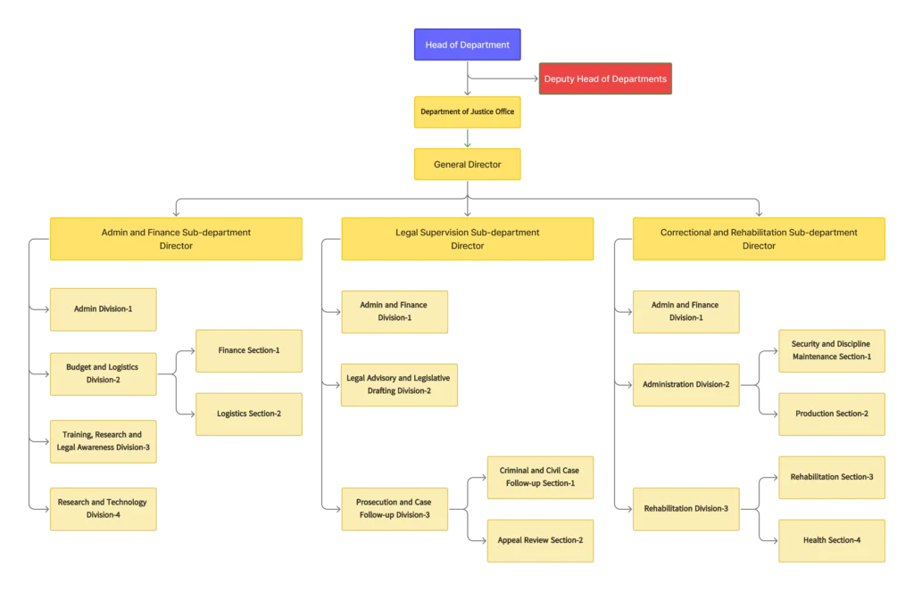 The Department of Justice is headed by a Department Head and two Deputy Heads. It includes the Department Office, the Administration and Finance Sub-department, the Legal Affairs Supervision Sub-department, and the Sub-department of Moral Correction and Rehabilitation.