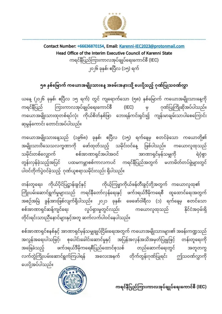 The Interim Executive Council of Karenni State(IEC) extends its warm congratulations on the occasion of the 58th Anniversary of Kayaw National Day, which falls on 15 April 2026. We sincerely wish that all Kayaw people remain safe from harm and enjoy good health, peace, and prosperity.