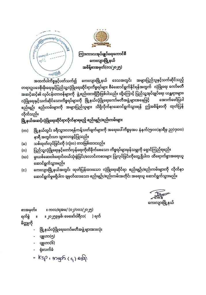Regarding the security matter, in order to maintain the rule of law and manage public security matters within the Kay lyar Township, the relevant Security Committee was formed and has been assigned to take its role. Therefore, the Township Security Committee hereby issues this order, which is related to the public administration mechanism and security matters, and announces to the public to be aware and follow the rules and regulations as below.