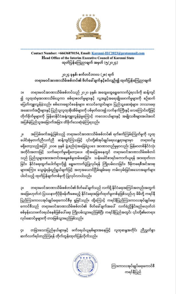 ၃။ တရားမဝင်အာဏာသိမ်းစစ်တပ်၏ ဖိတ်ခေါ်ချက်သည် လက်ရှိ နိုင်ငံရေးအကြပ်အတည်းအတွက် အဖြေမဟုတ်ဘဲ ပြဿနာကိုပိုမိုဖန်တီးစေမည့် နိုင်ငံရေးအမြတ်ထုတ်မှုတစ်ခုဖြစ်သည်ဟု မိမိတို့ ကရင်နီပြည်ကြားကာလအုပ်ချုပ်ရေးကောင်စီမှ ရှုမြင်သည်။ ထို့ကြောင့် ကရင်နီပြည်ကြားကာလအုပ်ချုပ်ရေးကောင်စီသည် တရားမဝင်အာဏာသိမ်းစစ်တပ်၏ ဖိတ်ခေါ်ချက်အပေါ် လက်ခံညှိနှိုင်းမည်မဟုတ်ဘဲ စစ်မှန်သောဖက်ဒရယ်စနစ်ဖြစ်ပေါ်ရေး ကြိုးပမ်းသွားမည်ဖြစ်ပြီး ကရင်နီပြည်အတွင်း ၎င်းတို့၏မတရားလုပ်ဆောင်မှုများကို တားမြစ်သွားမည်ဖြစ်သည်။