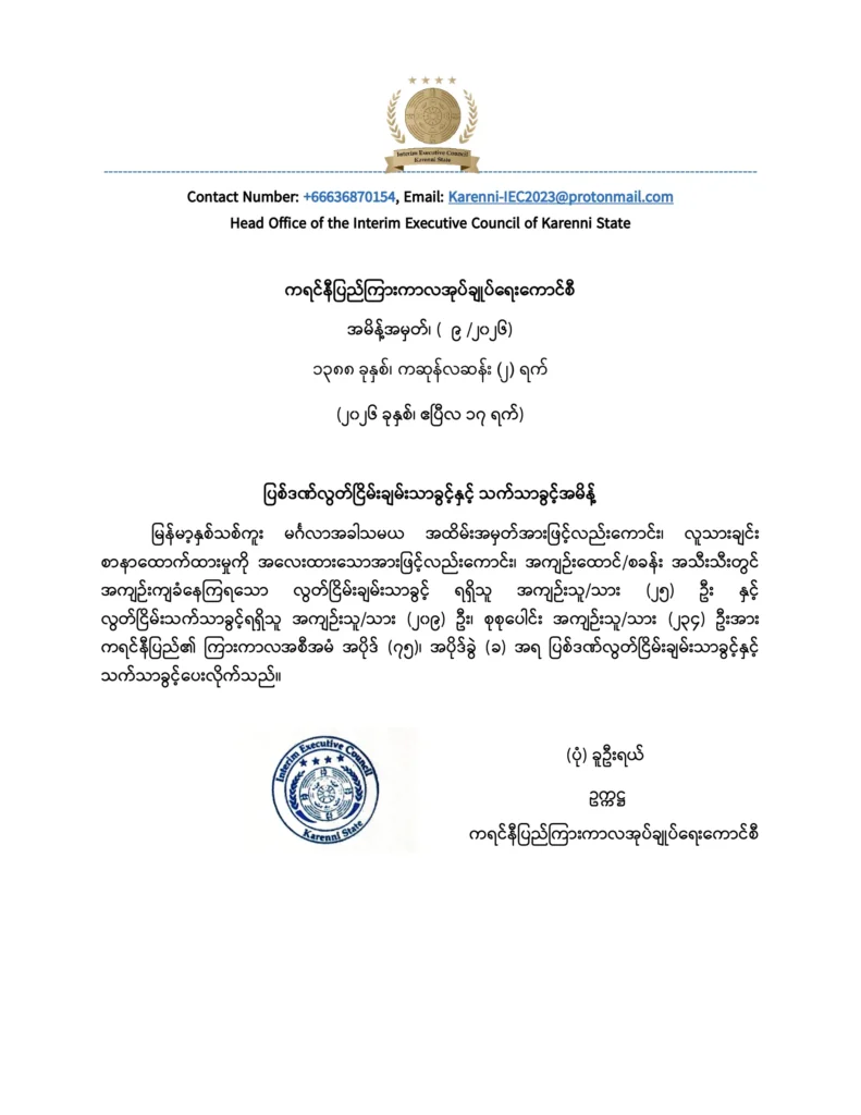မြန်မာ့နှစ်သစ်ကူး မင်္ဂလာအခါသမယ အထိမ်းအမှတ်အားဖြင့်လည်းကောင်း၊ လူသားချင်း စာနာထောက်ထားမှုကို အလေးထားသောအားဖြင့်လည်းကောင်း၊ အကျဉ်းထောင်/စခန်း အသီးသီးတွင် အကျဉ်းကျခံနေကြရသော လွတ်ငြိမ်းချမ်းသာခွင့် ရရှိသူ အကျဉ်းသူ/သား (၂၅) ဦး နှင့် လွတ်ငြိမ်းသက်သာခွင့်ရရှိသူ အကျဉ်းသူ/သား (၂၀၉) ဦး၊ စုစုပေါင်း အကျဉ်းသူ/သား (၂၃၄) ဦးအား ကရင်နီပြည်၏ ကြားကာလအစီအမံ အပိုဒ် (၇၅)၊ အပိုဒ်ခွဲ (ခ) အရ ပြစ်ဒဏ်လွတ်ငြိမ်းချမ်းသာခွင့်နှင့် သက်သာခွင့်ပေးလိုက်သည်။