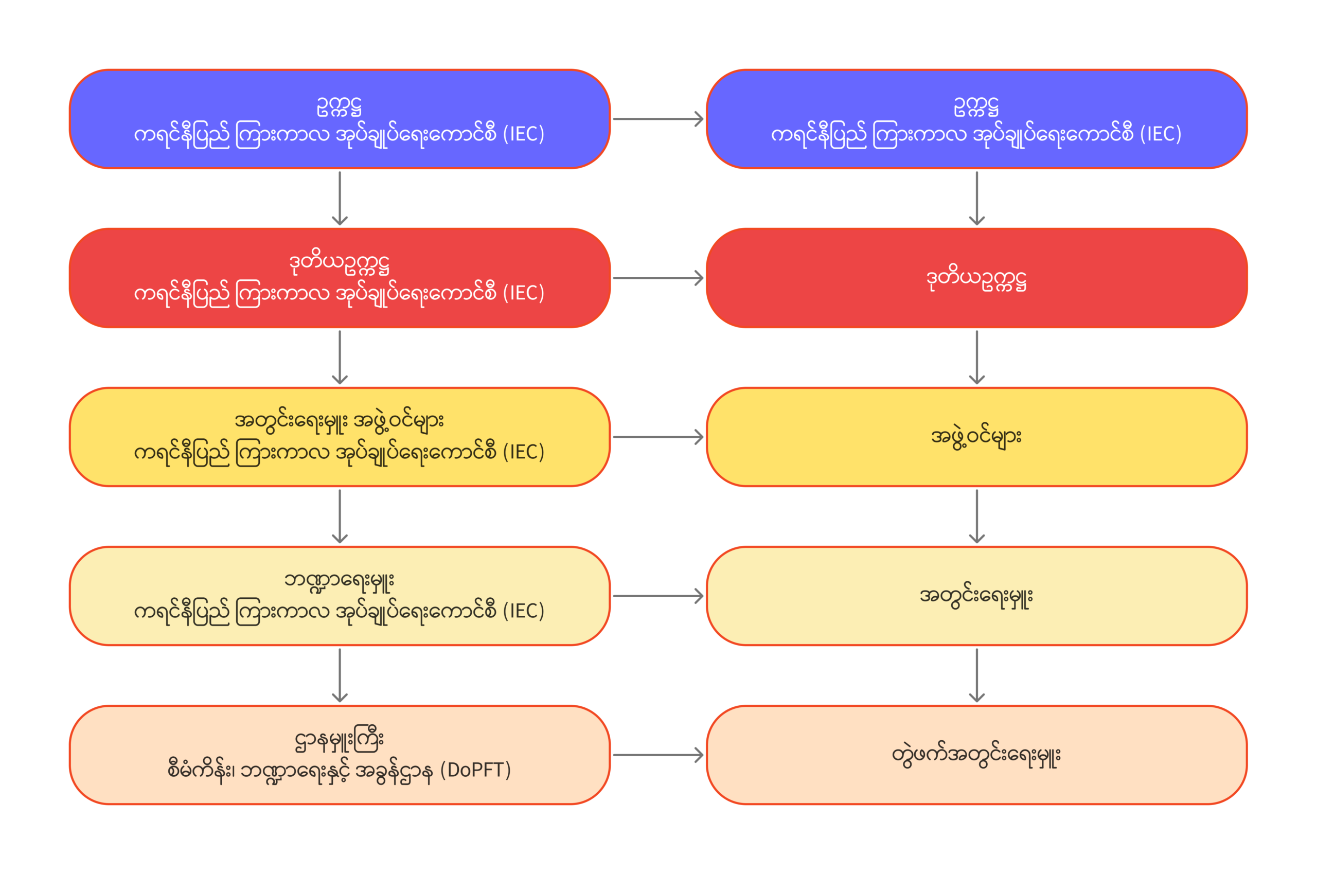 - (၄) နိုင်ငံတကာ အဖွဲ့အစည်း၊ အစိုးရအဖွဲ့နှင့် ပြည်တွင်း/ပြည်ပ ပုဂ္ဂလိကလုပ်ငန်းရှင်များနှင့် ချိတ်ဆက်၍ ချေးငွေများ ရရှိနိုင်ရန် ကြိုးပမ်းသွားရန်။