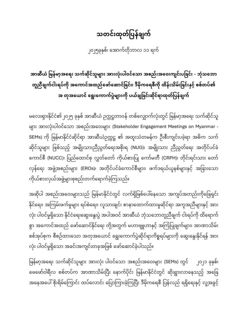 ၁။ စစ်တပ်၏ အတုအယောင် ရွေးကောက်ပွဲများကို ငြင်းပယ်ခြင်း – သက်ဆိုင်သူများအနေဖြင့် စစ် အုပ်စု စီစဉ်ထားသော ရွေးကောက်ပွဲသည် ဒီမိုကရေစီ ပြုပြင်ပြောင်းလဲမှုအရေခြုံကာ စစ်အုပ်ချုပ်ရေး ကို ခိုင်မာစေရန် ပုံဖော်ရေးဆွဲထားမှုအဖြစ်သတ်မှတ်ပြီး တညီတညွတ်တည်း ရှုတ်ချလိုက်သည်။ ဤ ရွေးကောက်ပွဲများသည် အကြမ်းဖက်မှုများ ရပ်စဲရေး၊ အားလုံးပါဝင်မှုရှိသော နိုင်ငံရေးဆွေးနွေးမှုပေါ် ပေါက်ရေးနှင့် လိုအပ်နေသူအားလုံးအတွက် အဟန့်အတားမရှိ လူသားချင်း စာနာထောက်ထားမှု အကူ အညီများပေးအပ်နိုင်ရေးတို့အားဦးစားပေးသည့် အာဆီယံ ဘုံသဘောတူညီချက်ငါးရပ်ကို တိုက်ရိုက် ဖီ လာဆန့်ကျင်နေသည်။ လက်ရှိ ဖြစ်ပွားနေသော အကြမ်းဖက်မှုများ၊ အကူအညီများကို ငြင်းပယ်ခြင်း နှင့် အဓိက သက်ဆိုင်သူများကို ချန်လှပ်ထားခြင်းတို့ကြားတွင် တစ်ဖက်သတ် ရွေးကောက်ပွဲများ ဆက် လက် ကျင်းပြခြင်းသည် တရားမဝင်သလို၊ အာဆီယံ၏ လုပ်ပိုင်ခွင့်နှင့် ယုံကြည်စိတ်ချရမှုကို တိုက် ရိုက်ထိပါးခြင်းလည်း ဖြစ်သည်။ စစ်အုပ်စုမှ ဘုံသဘောတူညီချက်ငါးရပ်ကို အတိအလင်းချိုးဖောက် နေစဉ် ၎င်းတို့ အာဏာနှင့် လမ်းပြမြေပုံကို တရားဝင်စေရေးအာဆီယံကို ကြိုးကိုင်ခြယ်လှယ်ရန် ကြိုး ပမ်းမှုများကို သက်ဆိုင်သူအားလုံးသည် စည်းလုံးညီညွတ်စွာ ငြင်းပယ်ကြောင်း။
